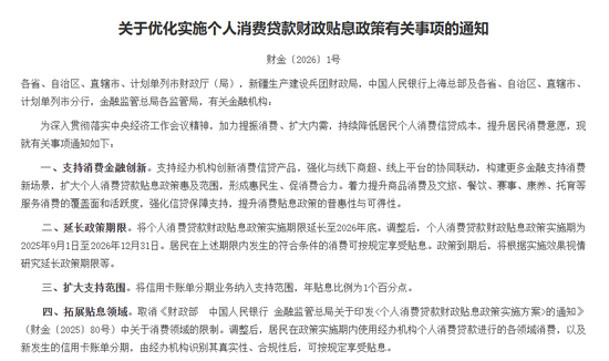 1月20日,财政部、央行和金融监管总局发布见知,对个东说念主耗尽贷款财政贴息战略进行优化调整。该战略实施期限将延迟至2026年12月31日,并在扶植范围、领域和额度等方面作念出蹙迫调整。